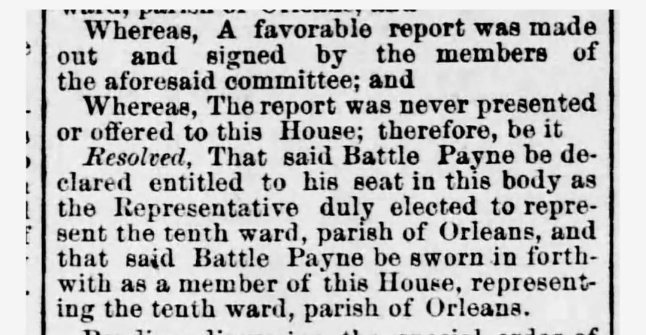 After the war, Battle Payne returned to New Orleans where he took up residence on Liberty Street between Jackson and Josephine. During Reconstruction, he also became a prominent political leader and activist, culminating in his election in 1874 to the Louisiana State Legislature as a representative of New Orleans’s Tenth Ward.